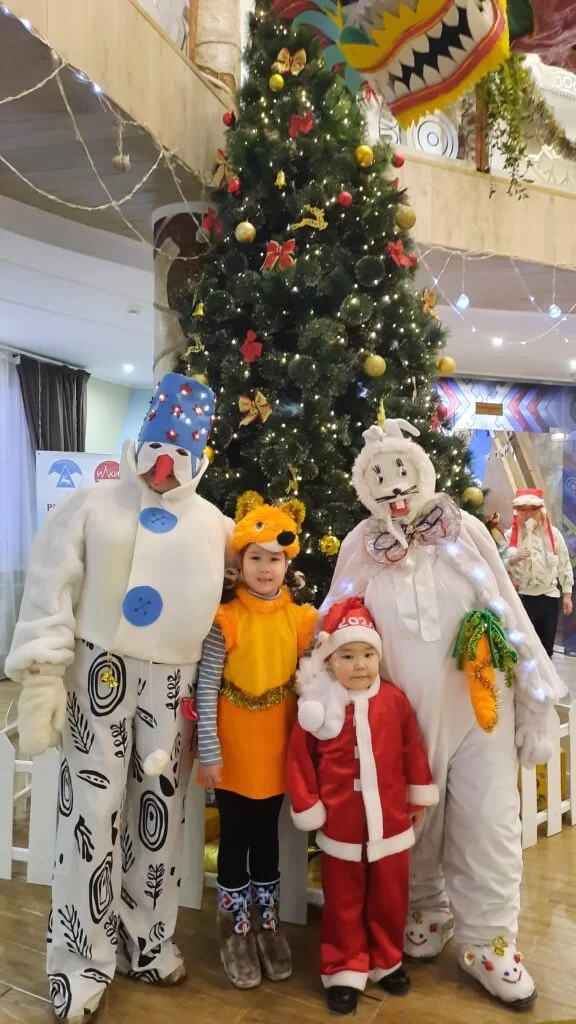 А окунуться в праздничную атмосферу нашим маленьким детям помогли Снеговичок и Зайчишка (воспитатель Винокурова Айталина Валерьевна и специалист по социальной работе Ирина Капитоновна Котельникова).